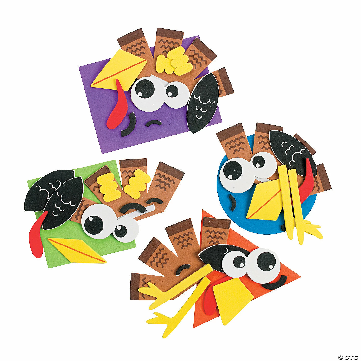 Use a variety of common shapes to make unique little gobblers! Foam with self-adhesive pieces. 4 1/2″ – 5″ x 4 3/4″ – 6″` Makes 12. © OTC Shape Turkey Craft Kit Template/a